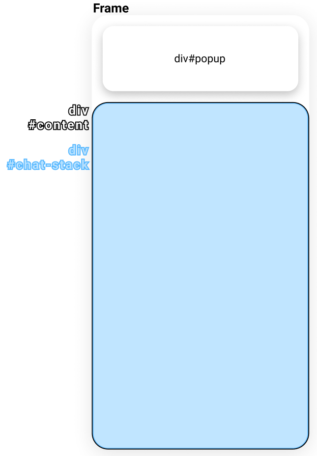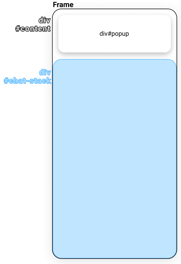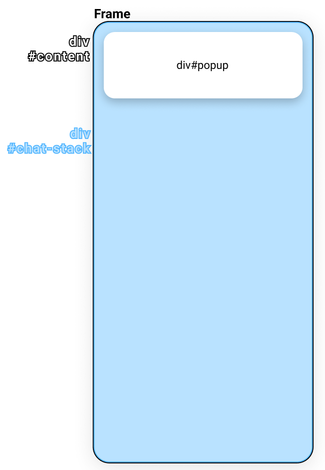 위와 같이 'div#popup' 주변에 빈 공간은 'div#chat-stack'의 'blue color' 색상이 보여지지 않고, Root element인 'Frame'의 background-color(none, white or transprent)가 보여질 것이다.