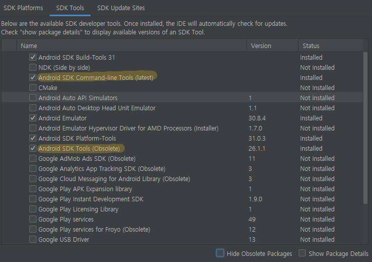 Android studio의 SDK Tools 옵션으로 접근해 필요한 패키지를 설치하여 해결할 수 있다.