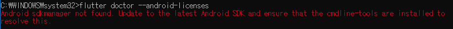 flutter 초기 세팅 과정의 약관 동의를 하기위해 실행하는 아래의 명령어가 오류나는 경우가 있다.