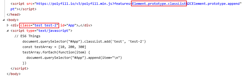 이때 개발자가 작성한 Script를 파싱 하기 전인 곳에 Polyfill script를 로드하여 사전에 기능을 채워 넣어 Element.append() method를 사용할 수 있습니다.