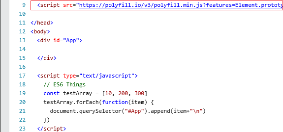 이때 개발자가 작성한 Script를 파싱 하기 전인 곳에 Polyfill script를 로드하여 사전에 기능을 채워 넣어 Element.append() method를 사용할 수 있습니다.