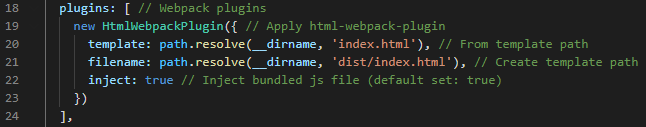 HtmlWebpackPlugin Class를 가져온 후, Instance를 생성하여 설정 객체 파라미터를 넘겨줍니다.